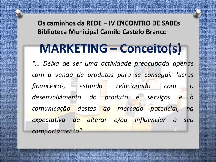 2. 2. MARKETING – Conceito(s)“… Deixa de ser uma actividade preocupada apenascom a venda de produtos para se conseguir lucrosfinanceiros, estando relacionada com odesenvolvimento do produto e serviços e àcomunicação destes ao mercado potencial, naexpectativa de alterar e/ou influenciar o seucomportamento”.
