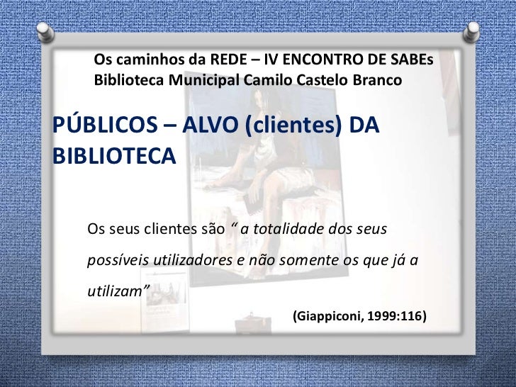 13. 13. PÚBLICOS – ALVO (clientes) DABIBLIOTECA Os seus clientes são “ a totalidade dos seus possíveis utilizadores e não somente os que já a utilizam” (Giappiconi, 1999:116)