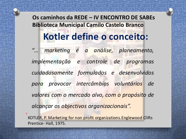3. 3. 1 Kotler define o conceito: “… marketing é a análise, planeamento, implementação e controle de programas cuidadosamente formulados e desenvolvidos para provocar intercâmbios voluntários de valores com o mercado alvo, com o propósito de alcançar os objectivos organizacionais”.1 KOTLER, P. Marketing for non profit organizations.Englewood Clifts Prentice- Hall, 1975.