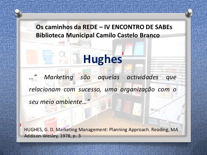 4. 4. 2 Hughes …” Marketing são aquelas actividades que relacionam com sucesso, uma organização com o seu meio ambiente…”HUGHES, G. D. Marketing Management: Planning Approach. Reading, MAAddison-Wesley, 1978, p. 3