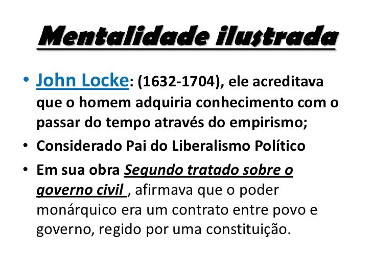 8. 8. Mentalidade ilustrada• John Locke: (1632-1704), ele acreditava que o homem adquiria conhecimento com o passar do tempo através do empirismo;• Considerado Pai do Liberalismo Político• Em sua obra Segundo tratado sobre o governo civil , afirmava que o poder monárquico era um contrato entre povo e governo, regido por uma constituição.