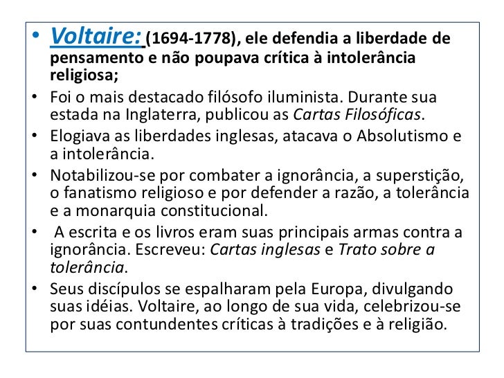 10. 10. • Voltaire: (1694-1778), ele defendia a liberdade de pensamento e não poupava crítica à intolerância religiosa;• Foi o mais destacado filósofo iluminista. Durante sua estada na Inglaterra, publicou as Cartas Filosóficas.• Elogiava as liberdades inglesas, atacava o Absolutismo e a intolerância.• Notabilizou-se por combater a ignorância, a superstição, o fanatismo religioso e por defender a razão, a tolerância e a monarquia constitucional.• A escrita e os livros eram suas principais armas contra a ignorância. Escreveu: Cartas inglesas e Trato sobre a tolerância.• Seus discípulos se espalharam pela Europa, divulgando suas idéias. Voltaire, ao longo de sua vida, celebrizou-se por suas contundentes críticas à tradições e à religião.