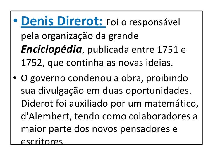 12. 12. • Denis Direrot: Foi o responsável pela organização da grande Enciclopédia, publicada entre 1751 e 1752, que continha as novas ideias.• O governo condenou a obra, proibindo sua divulgação em duas oportunidades. Diderot foi auxiliado por um matemático, dAlembert, tendo como colaboradores a maior parte dos novos pensadores e escritores.
