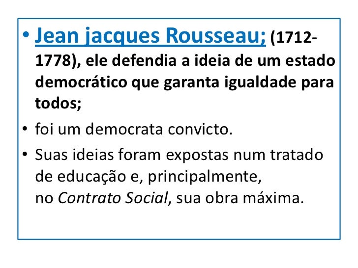 13. 13. • Jean jacques Rousseau; (1712- 1778), ele defendia a ideia de um estado democrático que garanta igualdade para todos;• foi um democrata convicto.• Suas ideias foram expostas num tratado de educação e, principalmente, no Contrato Social, sua obra máxima.