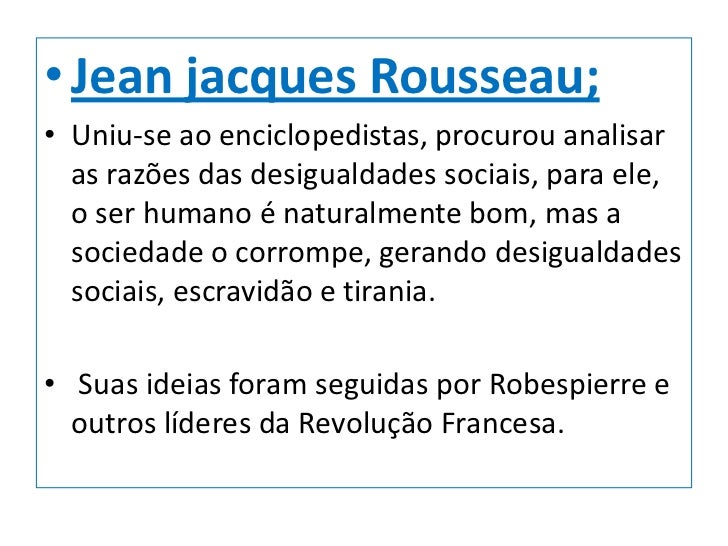 14. 14. • Jean jacques Rousseau;• Uniu-se ao enciclopedistas, procurou analisar as razões das desigualdades sociais, para ele, o ser humano é naturalmente bom, mas a sociedade o corrompe, gerando desigualdades sociais, escravidão e tirania.• Suas ideias foram seguidas por Robespierre e outros líderes da Revolução Francesa.