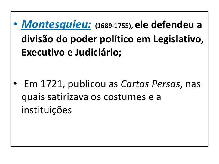 15. 15. • Montesquieu: (1689-1755), ele defendeu a divisão do poder político em Legislativo, Executivo e Judiciário;• Em 1721, publicou as Cartas Persas, nas quais satirizava os costumes e a instituições