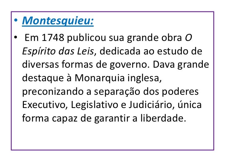 16. 16. • Montesquieu:• Em 1748 publicou sua grande obra O Espírito das Leis, dedicada ao estudo de diversas formas de governo. Dava grande destaque à Monarquia inglesa, preconizando a separação dos poderes Executivo, Legislativo e Judiciário, única forma capaz de garantir a liberdade.