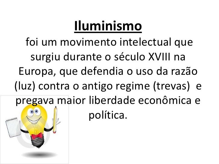 1. 1. Iluminismo foi um movimento intelectual que surgiu durante o século XVIII na Europa, que defendia o uso da razão(luz) contra o antigo regime (trevas) epregava maior liberdade econômica e política.