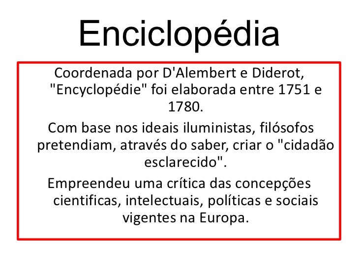19. 19. Enciclopédia Coordenada por DAlembert e Diderot, "Encyclopédie" foi elaborada entre 1751 e 1780. Com base nos ideais iluministas, filósofospretendiam, através do saber, criar o "cidadão esclarecido". Empreendeu uma crítica das concepções cientificas, intelectuais, políticas e sociais vigentes na Europa.