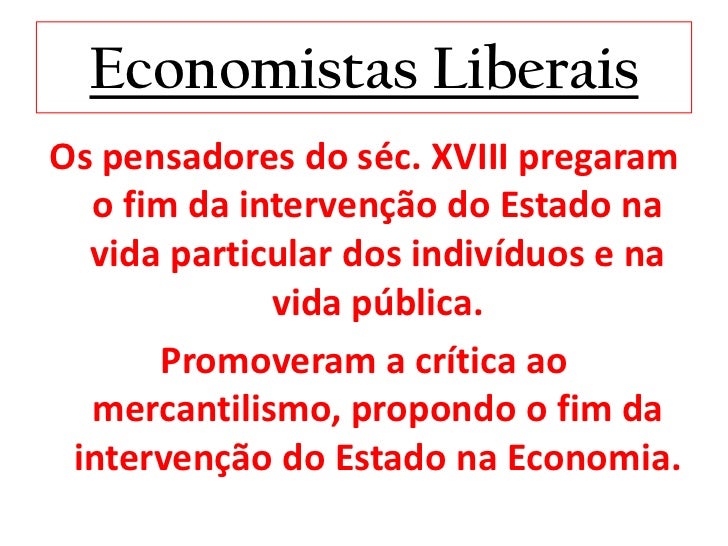 20. 20. Economistas LiberaisOs pensadores do séc. XVIII pregaram o fim da intervenção do Estado na vida particular dos indivíduos e na vida pública. Promoveram a crítica ao mercantilismo, propondo o fim da intervenção do Estado na Economia.