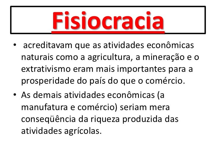22. 22. Fisiocracia• acreditavam que as atividades econômicas naturais como a agricultura, a mineração e o extrativismo eram mais importantes para a prosperidade do país do que o comércio.• As demais atividades econômicas (a manufatura e comércio) seriam mera conseqüência da riqueza produzida das atividades agrícolas.