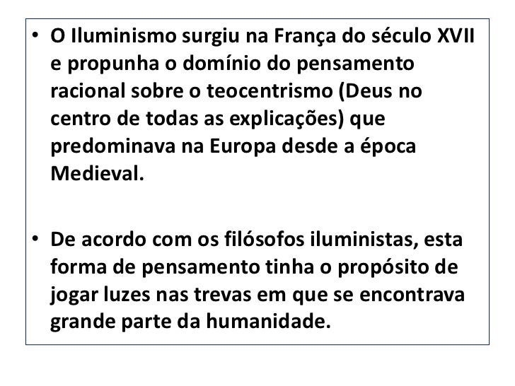 2. 2. • O Iluminismo surgiu na França do século XVII e propunha o domínio do pensamento racional sobre o teocentrismo (Deus no centro de todas as explicações) que predominava na Europa desde a época Medieval.• De acordo com os filósofos iluministas, esta forma de pensamento tinha o propósito de jogar luzes nas trevas em que se encontrava grande parte da humanidade.