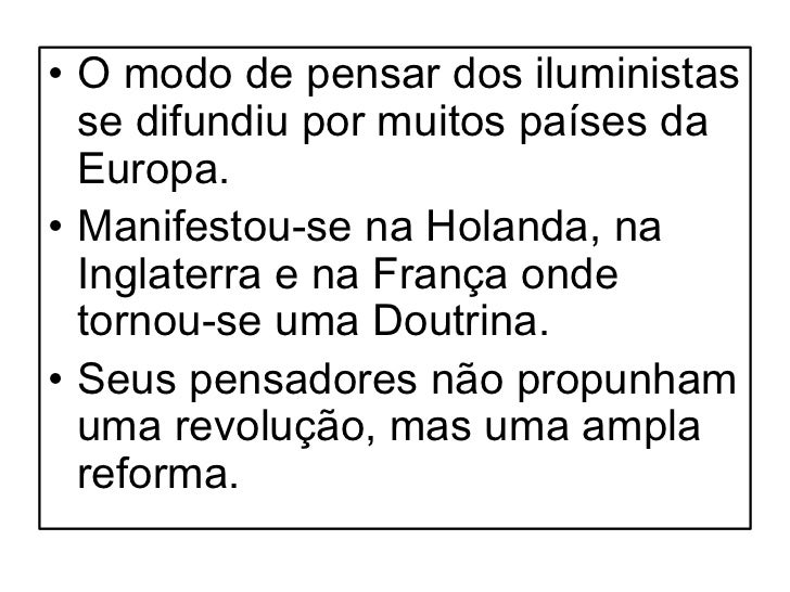 6. 6. • O modo de pensar dos iluministas se difundiu por muitos países da Europa.• Manifestou-se na Holanda, na Inglaterra e na França onde tornou-se uma Doutrina.• Seus pensadores não propunham uma revolução, mas uma ampla reforma.