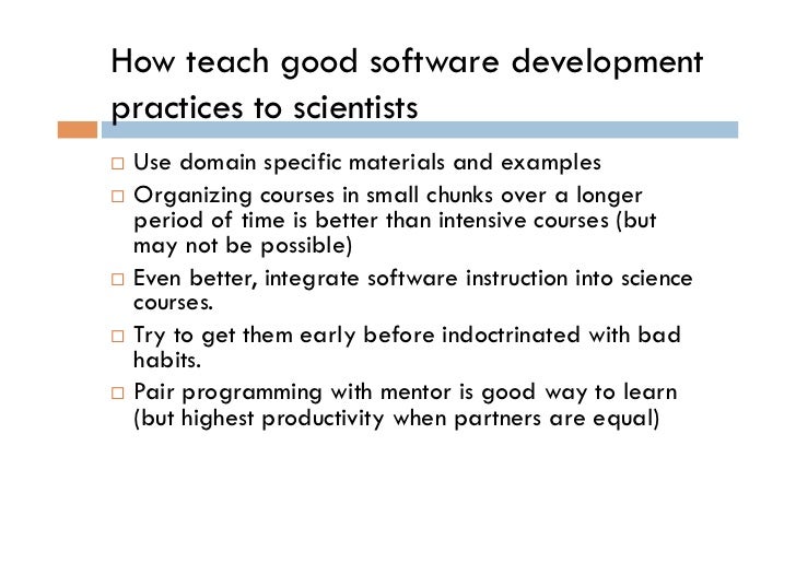 5. 5. How teach good software developmentpractices to scientists  Use domain specific materials and examples  Organizing courses in small chunks over a longer period of time is better than intensive courses (but may not be possible)  Even better, integrate software instruction into science courses.  Try to get them early before indoctrinated with bad habits.  Pair programming with mentor is good way to learn (but highest productivity when partners are equal)