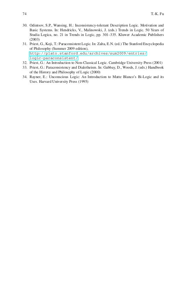 12. 12. 74 T.-K. Fu30. Odintsov, S.P., Wansing, H.: Inconsistency-tolerant Description Logic. Motivation and Basic Systems. In: Hendricks, V., Malinowski, J. (eds.) Trends in Logic. 50 Years of Studia Logica, no. 21 in Trends in Logic, pp. 301–335. Kluwer Academic Publishers (2003)31. Priest, G., Koji, T.: Paraconsistent Logic. In: Zalta, E.N. (ed.) The Stanford Encyclopedia of Philosophy (Summer 2009 edition), http://plato.stanford.edu/archives/sum2009/entries/ logic-paraconsistent/32. Priest, G.: An Introduction to Non-Classical Logic. Cambridge University Press (2001)33. Priest, G.: Paraconsistency and Dialetheism. In: Gabbay, D., Woods, J. (eds.) Handbook of the History and Philosophy of Logic (2000)34. Rayner, E.: Unconscious Logic: An Introduction to Matte Blanco’s Bi-Logic and its Uses. Harvard University Press (1995)