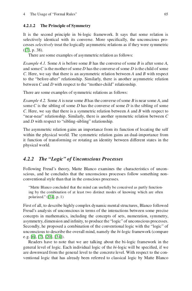 3. 3. 4 The Usage of “Formal Rules” 654.2.1.2 The Principle of SymmetryIt is the second principle in bi-logic framework. It says that some relation isselectively identical with its converse. More specifically, the unconscious pro-cesses selectively treat the logically asymmetric relations as if they were symmetric([7], p. 38). There are some examples of asymmetric relation as follows:Example 4.1. Some A is before some B has the converse of some B is after some A,and some C is the mother of some D has the converse of some D is the child of someC. Here, we say that there is an asymmetric relation between A and B with respectto the “before-after” relationship. Similarly, there is another asymmetric relationbetween C and D with respect to the “mother-child” relationship.There are some examples of symmetric relations as follows:Example 4.2. Some A is near some B has the converse of some B is near some A, andsome C is the sibling of some D has the converse of some D is the sibling of someC. Here, we say that there is a symmetric relation between A and B with respect to“near-near” relationship. Similarly, there is another symmetric relation between Cand D with respect to “sibling-sibling” relationship.The asymmetric relation gains an importance from its function of locating the selfwithin the physical world. The symmetric relation gains an dual-importance fromit function of transforming or rotating an identity between different states in thephysical world.4.2.2 The “Logic” of Unconscious ProcessesFollowing Freud’s theory, Matte Blanco examines the characteristics of uncon-scious, and he concludes that the unconscious processes follow something non-conventional style than that in the conscious processes. “Matte Blanco concluded that the mind can usefully be conceived as partly function- ing by the combination of at least two distinct modes of knowing which are often polarized.” ([34], p. 1)First of all, to describe highly complex dynamic mental structures, Blanco followedFreud’s analysis of unconscious in terms of the interactions between some preciseconcepts in mathematics, including the concepts of sets, numeration, symmetry,asymmetry, dimension and infinity, to produce the “logic” of unconscious processes.Secondly, he proposed a combination of the conventional logic with the “logic” ofunconscious to describe the overall mind, namely the bi-logic framework (comparee.g. [6], [7], [20], [34]). Readers have to note that we are talking about the bi-logic framework in thegeneral level of logic. Each individual logic of the bi-logic will be specified, if weare downward from the general level to the concrete level. With respect to the con-ventional logic that has already been referred to classical logic by Matte Blanco