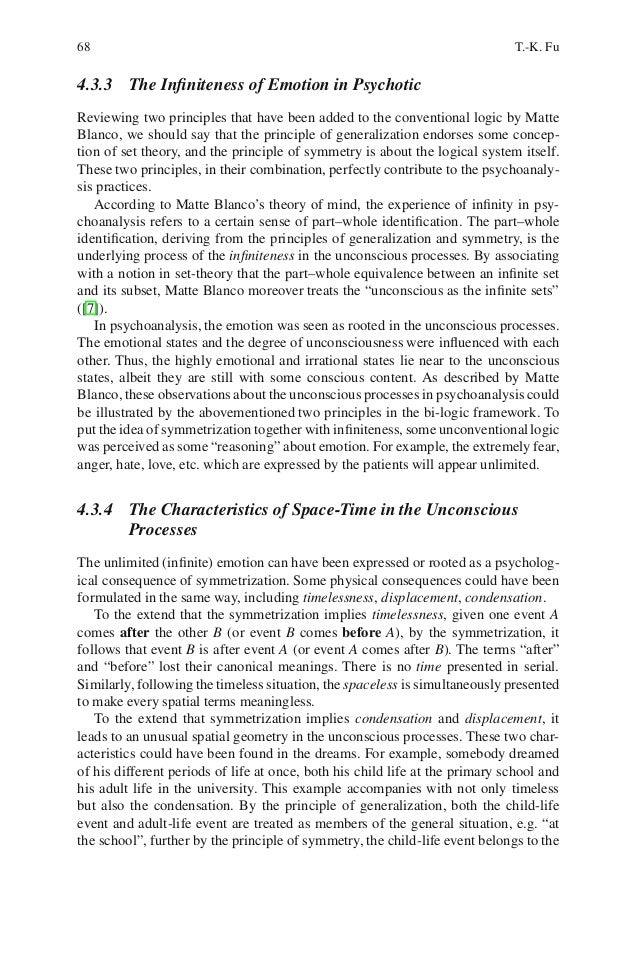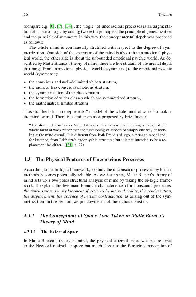 2. 2. 64 T.-K. Fu The structure of the paper is as follows: In Section 2, we present the bi-logicframework based on the Matte Blanco’s theory of mind and introduce the concept of“mental depth” with respect to the processes of symmetrization. We here introducefive stratum used in the Matte Blanco’s theory of mind, and discuss their varyingunconsciousness. Section 3 then discusses a number of physical features of uncon-scious processes. Section 4 discusses the logical features of unconscious processes,including inconsistency, explosion, and paraconsistency that have already taken asthe formal properties in modern science, in particular, we turn our attention to thearea of non-classical logics. Finally, section 5 summarizes the paper and discussesfuture work.4.2 From Freud to Bi-logic FrameworkThe study of unconscious processes can be carried out to a quite large extent thatFreud’s theory has used in psychoanalysis. Generally speaking, Freud’s greatestcontribution was probably to show the importance of unconscious processes andto formulate five main characteristics of unconscious processes: the timelessness,the replacement of external by internal reality, the condensation, the displacement,and the absence of mutual contradiction (compare e.g. [7], [16], [17], [34]). The characteristics of unconscious processes was re-explained by Matte Blancoin the later 1970s. He captured a very abstract and flexible notion of logical systemto describe the unconscious processes, moreover related the psychoanalytic studiesto this logical system, namely the bi-logic framework (see e.g. [6], [7], [8], [34]). The insight of bi-logic viewpoint shows the importance of the symmetrization inmental processes. In this way, the part-whole identity and the experiences of infin-ity, observed in psychoanalysis practices can be fully explained. Blanco followedFreud and shew how the main characteristics of unconscious functioning can beseen as arising out of symmetrized thought. In the following, we describe the bi-logic framework to illustrate the characteristics in the unconscious processes.4.2.1 Two Principles in the Bi-logic Framework4.2.1.1 The Principle of GeneralizationIt is the first principle in bi-logic framework. It says that any individual thing (per-son, object, concept) is treated as if it was a member of a class (set) which containsother members. The class is further treated as a subclass of a more general class,and so on. It is one function of the unconscious processes to look for the similarities with theclassification. It has been treated as one peculiarity of the unconscious processes. Itstates that people abstract a particular thing to a general level in terms of the classmembership, i.e., leap upward to the more general level of the class hierarchies inthe unconscious processes.