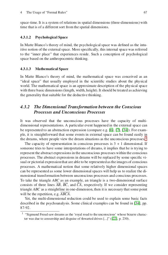 5. 5. 4 The Usage of “Formal Rules” 67space-time. It is a system of relations in spatial dimensions (three-dimensions) withtime that is of a different sort from the spatial dimensions.4.3.1.2 Psychological SpaceIn Matte Blanco’s theory of mind, the psychological space was defined as the intu-itive notion of the external space. More specifically, this internal space was referredto the “inner place” that experiences reside. Such a conception of psychologicalspace based on the anthropocentric thinking.4.3.1.3 Mathematical SpaceIn Matte Blanco’s theory of mind, the mathematical space was conceived as an“ideal space” that usually employed in the scientific studies about the physicalworld. The mathematical space is an approximate description of the physical spacewith three basic dimensions (length, width, height). It should be treated as achievingthe generality that suitable for the deductive thinking.4.3.2 The Dimensional Transformation between the Conscious Processes and Unconscious ProcessesIt was observed that the unconscious processes have the capacity of multi-dimensional representations. A particular event happened in the external space canbe represented to an abstraction expression (compare e.g. [6], [7], [34]). For exam-ple, it is straightforward that some events in external space can be found easily inthe dreams, where people view the dream situations as the unconscious processes.1 The capacity of representation in conscious processes is 3 + 1 dimensional. Ifsomeone tries to have some interpretations of dreams, it implies that he is trying torepresent the abstract expressions in the unconscious processes within the consciousprocesses. The abstract expressions in dreams will be replaced by some specific vi-sual or pictorial expression that are able to be represented as the images of consciousprocesses. A mathematical notion that some relatively higher dimensional spacescan be represented as some lower dimensional spaces will help us to realize the di-mensional transformation between unconscious processes and conscious processes.To take the triangle ABC as an example, an triangle is a two-dimensional surfaceconsists of three lines AB, BC, and CA, respectively. If we consider representingtriangle ABC as a straightline in one-dimension, then it is necessary that some pointwill be the repetition, e.g. ABCA. Yet, the multi-dimensional reduction could be used to explain some basic factsdescribed in the psychoanalysis. Some clinical examples can be found in [34], pp.87-92.1 “Sigmund Freud saw dreams as the ‘royal road to the unconscious’ whose bizarre charac- ter was due to censorship and disguise of thwarted drives [...]” ([22], p. 230).