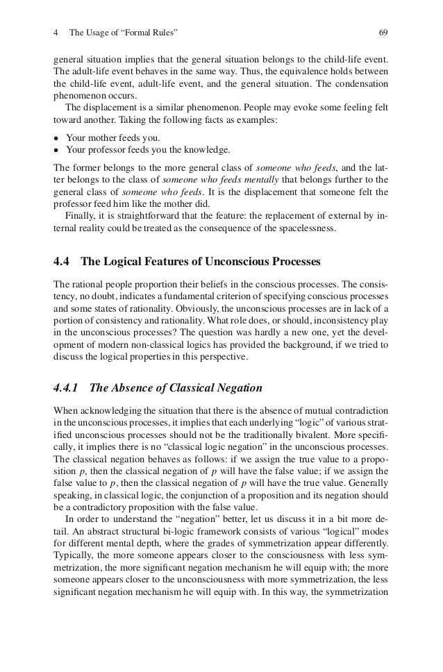 11. 11. 4 The Usage of “Formal Rules” 7311. Clarke, C.J.S.: Both/And Thinking: Physics and Reality. In: Clarke, C.J.S. (ed.) Ways of Knowing: Science and Mysticism Today, pp. 143–158. Imprint Academic Publisher (2005)12. Dreyfus, H.: What Computers Still Can’t Do: A Critique of Artificial Reason. MIT Press, Cambridge (1992)13. Dreyfus, H., Dreyfus, S.: Mind Over Machine: The Power of Human Intuition and Ex- pertise in the Era of the Computer. Free Press, New York (1986)14. Dreyfus, H.: What Computers Can’t Do: The Limits of Artificial Intelligence (revised) (1979)15. Dreyfus, H.: What Computers Can’t Do: The Limits of Artificial Intelligence (1972)16. Freud, S.: The Essentials of Psycho-Analysis (Vintage Classics), Vintage Classics, New edition (2005)17. Freud, S.: The Unconscious (Penguin Modern Classics Translated Texts), Penguin Clas- sics (2005)18. Fu, T.-K., Kutz, O.: The Analysis and Synthesis of Logic Translation. In: Proceedings of the Twenty-Fifth International Florida Artificial Intelligence Research Society Confer- ence: AI, Cognitive Semantics, Computational Linguistics and Logics (AICogSem), pp. 289–294. AAAI Press (2012)19. Fu, T.-K.: A Formal Framework for the Unconscious Processes in Human Intelligence. In: Proceedings of the Twenty-Fifth International Florida Artificial Intelligence Research Society Conference: AI, Cognition and AI: Comparing Human Capability and Experi- ence with Today’s Computer Models, pp. 359–362. AAAI Press (2012)20. Fu, T.-K.: A Study on Bi-logic (A Reflection on Wittgenstein). In: Munz, V.A., Puhl, K., Wang, J. (eds.) Language and World. Papers of the 32nd International Wittgenstein Sym- posium, Kirchberg am Wechsel/Lower Austria., vol. XVII, pp. 142–144. The Wittgen- stein Archives at the University of Bergen (WAB)21. Gabbay, D.: What is a Logical System? Oxford University Press (1994)22. Hameroff, S.: Consciousness, Neurobiology and Quantum Mechanics: The Case for a Connection. In: Tuszynski, J. (ed.) The Emerging Physics of Consciousness, pp. 193– 253. Springer (2007)23. Jech, T.: Set Theory: The Third Millennium Edition, Revised and Expanded. Springer (2003)24. Kutz, O., Mossakowski, T., Dominik, L.: Carnap, Goguen, and the Hyperontologies, Logica Universalis. Special Issue on “Is Logic Universal?” 4(2), 255–333 (2010)25. Ma, Y., Hitzler, P.: Distance-based Measures of Inconsistency and Incoherency for De- scription Logics. In: Haarslev, V., Toman, D., Weddell, G. (eds.) Proceedings of the 23rd International Workshop on Description Logics (DL 2010), CEUR Workshop Proceed- ings, Waterloo, Canada, vol. 573, pp. 475–485 (2010)26. Ma, Y., Hitzler, P., Lin, Z.: Algorithms for Paraconsistent Reasoning with OWL. In: Franconi, E., Kifer, M., May, W. (eds.) ESWC 2007. LNCS, vol. 4519, pp. 399–413. Springer, Heidelberg (2007)27. Mossakowski, T., Goguen, J., Diaconescu, R., Tarlecki, A.: What is a Logic Translation? Logica Universeralis 3(1), 95–124 (2009)28. Mossakowski, T., Goguen, J., Diaconescu, R., Tarlecki, A.: What is a Logic (revised ver- sion). In: B´ ziau, J.-Y. (ed.) Logica Universalis, pp. 111–133. Birkh¨ user Verlag, Basel e a (2007)29. Odintsov, S.P., Wansing, H.: Inconsistency-tolerant Description Logic. Part II: A tableau algorithm for CALCC. Journal of Applied Logic 6(3), 343–360 (2008)