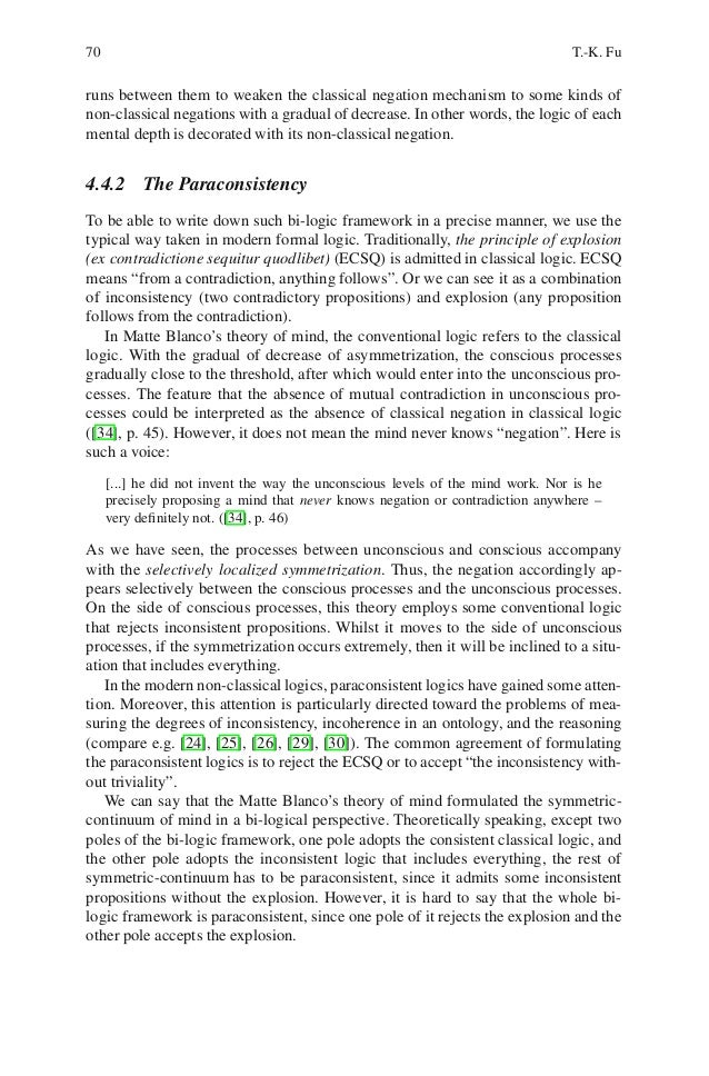 8. 8. 70 T.-K. Furuns between them to weaken the classical negation mechanism to some kinds ofnon-classical negations with a gradual of decrease. In other words, the logic of eachmental depth is decorated with its non-classical negation.4.4.2 The ParaconsistencyTo be able to write down such bi-logic framework in a precise manner, we use thetypical way taken in modern formal logic. Traditionally, the principle of explosion(ex contradictione sequitur quodlibet) (ECSQ) is admitted in classical logic. ECSQmeans “from a contradiction, anything follows”. Or we can see it as a combinationof inconsistency (two contradictory propositions) and explosion (any propositionfollows from the contradiction). In Matte Blanco’s theory of mind, the conventional logic refers to the classicallogic. With the gradual of decrease of asymmetrization, the conscious processesgradually close to the threshold, after which would enter into the unconscious pro-cesses. The feature that the absence of mutual contradiction in unconscious pro-cesses could be interpreted as the absence of classical negation in classical logic([34], p. 45). However, it does not mean the mind never knows “negation”. Here issuch a voice: [...] he did not invent the way the unconscious levels of the mind work. Nor is he precisely proposing a mind that never knows negation or contradiction anywhere – very definitely not. ([34], p. 46)As we have seen, the processes between unconscious and conscious accompanywith the selectively localized symmetrization. Thus, the negation accordingly ap-pears selectively between the conscious processes and the unconscious processes.On the side of conscious processes, this theory employs some conventional logicthat rejects inconsistent propositions. Whilst it moves to the side of unconsciousprocesses, if the symmetrization occurs extremely, then it will be inclined to a situ-ation that includes everything. In the modern non-classical logics, paraconsistent logics have gained some atten-tion. Moreover, this attention is particularly directed toward the problems of mea-suring the degrees of inconsistency, incoherence in an ontology, and the reasoning(compare e.g. [24], [25], [26], [29], [30]). The common agreement of formulatingthe paraconsistent logics is to reject the ECSQ or to accept “the inconsistency with-out triviality”. We can say that the Matte Blanco’s theory of mind formulated the symmetric-continuum of mind in a bi-logical perspective. Theoretically speaking, except twopoles of the bi-logic framework, one pole adopts the consistent classical logic, andthe other pole adopts the inconsistent logic that includes everything, the rest ofsymmetric-continuum has to be paraconsistent, since it admits some inconsistentpropositions without the explosion. However, it is hard to say that the whole bi-logic framework is paraconsistent, since one pole of it rejects the explosion and theother pole accepts the explosion.