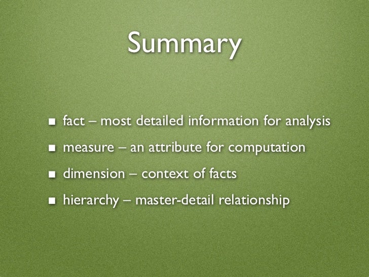 10. 10. Summary ■ fact – most detailed information for analysis ■ measure – an attribute for computation ■ dimension – context of facts ■ hierarchy – master-detail relationship