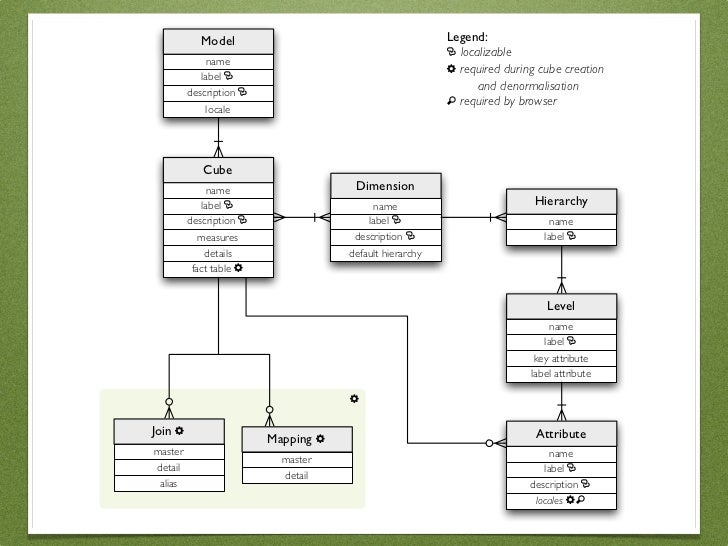 25. 25. Model Legend: "#localizable name !#required during cube creation label " description " and denormalisation $#required by browser locale Cube name Dimension label " name Hierarchy description " label " name measures description " label " details default hierarchy fact table ! Level name label " key attribute label attribute ! Join ! Attribute Mapping ! master name master detail label " detail alias description " locales !$