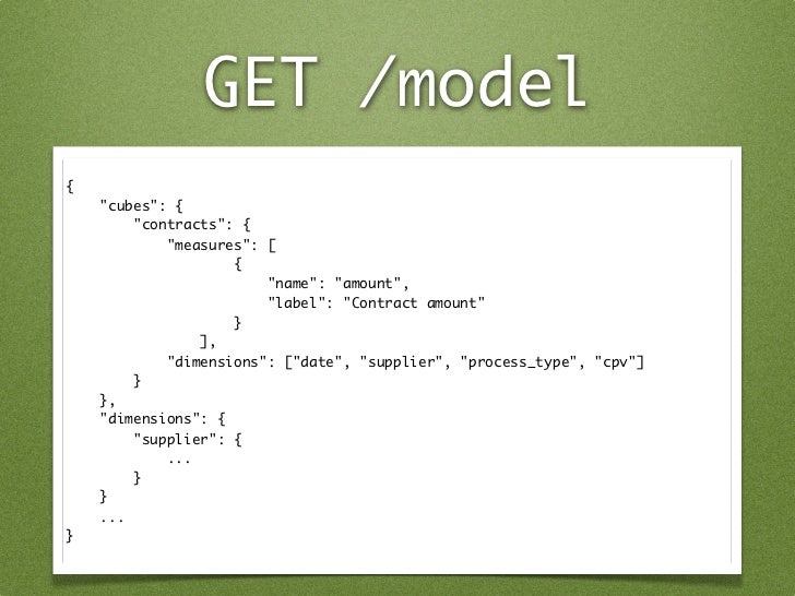 28. 28. GET /model { "cubes": { "contracts": { "measures": [ { "name": "amount", "label": "Contract amount" } ], "dimensions": ["date", "supplier", "process_type", "cpv"] } }, "dimensions": { "supplier": { ... } } ... }