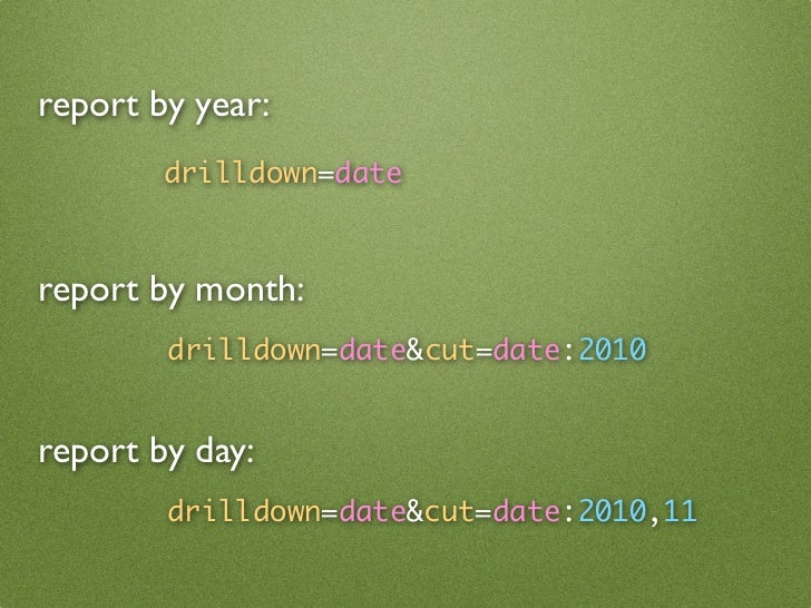 45. 45. report by year: drilldown=date report by month: drilldown=date&cut=date:2010 report by day: drilldown=date&cut=date:2010,11