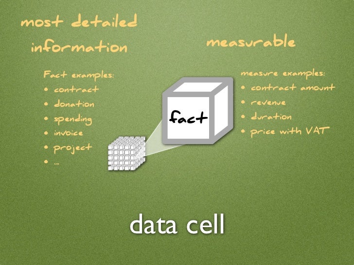 5. 5. most detailed information measurable Fact examples: measure examples: • contract • contract amount • donation • revenue • spending fact • duration • invoice • price with VAT • project • ... data cell