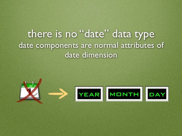 50. 50. there is no “date” data type date components are normal attributes of date dimension year month day