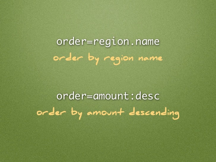 54. 54. order=region.name order by region name order=amount:desc order by amount descending