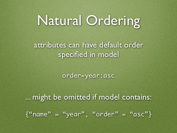 55. 55. Natural Ordering attributes can have default order specified in model order=year:asc ... might be omitted if model contains: {“name” = “year”, “order” = “asc”}