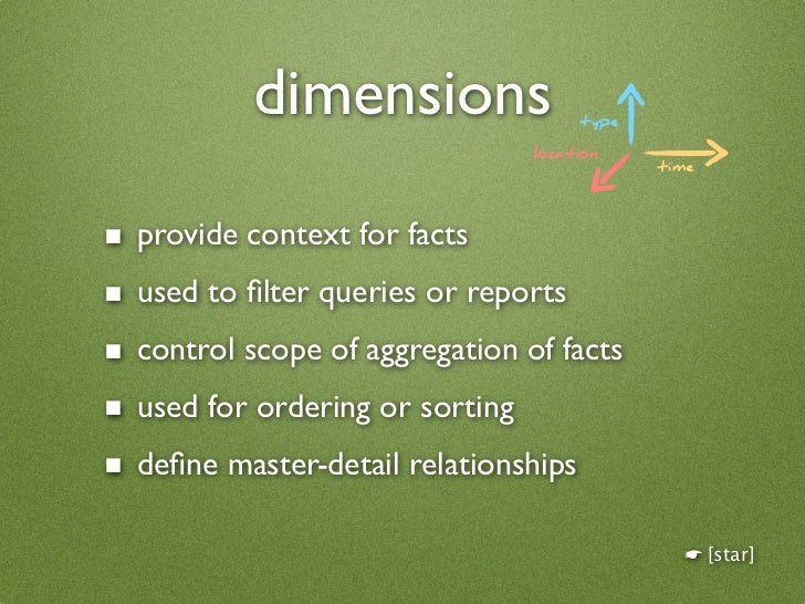 7. 7. dimensions type location time ■ provide context for facts ■ used to filter queries or reports ■ control scope of aggregation of facts ■ used for ordering or sorting ■ define master-detail relationships ☛ [star]