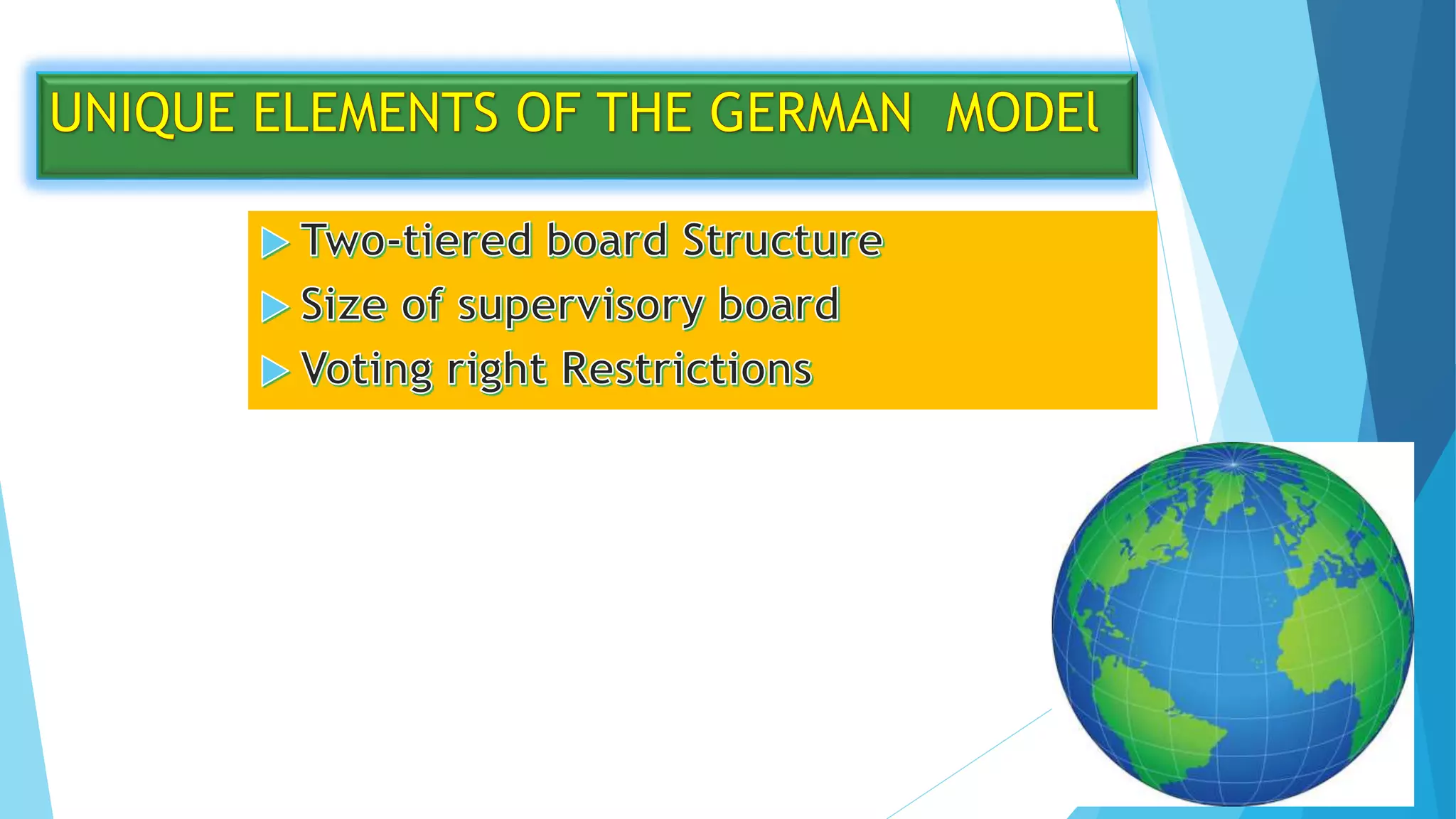 This document summarizes the key elements of the German model of corporate governance. It outlines that the German model is characterized by the important role of large shareholders, particularly banks, ownership of companies. It also notes the two-tier board structure, with a management board and supervisory board, and labor representation on the supervisory board for large companies. The document concludes by stating that the German system of corporate governance emphasizes the role of large shareholders and banks, this two-tier board structure, and is regulated by both federal and state law.