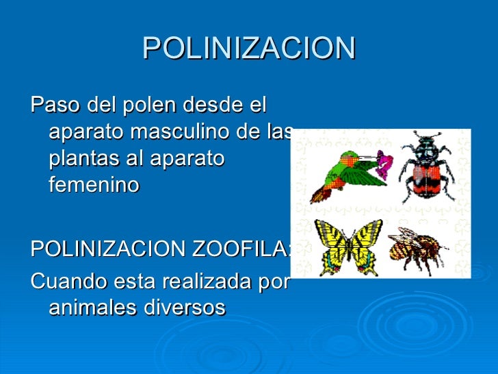 7. 11. POLINIZACION <ul><li>Paso del polen desde el aparato masculino de las plantas al aparato femenino </li></ul><ul><li>POLINIZACION ZOOFILA: </li></ul><ul><li>Cuando esta realizada por animales diversos </li></ul>