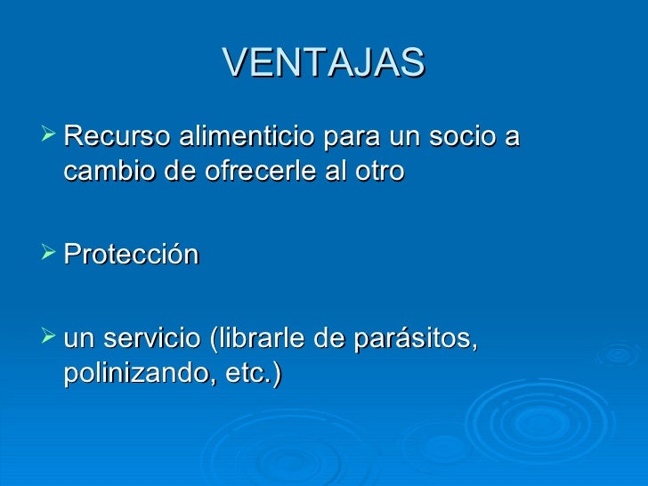 10. 14. VENTAJAS <ul><li>Recurso alimenticio para un socio a cambio de ofrecerle al otro </li></ul><ul><li>Protección </li></ul><ul><li>un servicio (librarle de parásitos, polinizando, etc.) </li></ul>