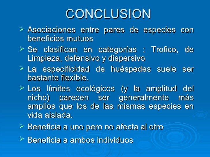 11. 15. CONCLUSION <ul><li>Asociaciones entre pares de especies con beneficios mutuos </li></ul><ul><li>Se clasifican en categorías : Trofico, de Limpieza, defensivo y dispersivo </li></ul><ul><li>La especificidad de huéspedes suele ser bastante flexible . </li></ul><ul><li>L os límites ecológicos (y la amplitud del nicho) parecen ser generalmente más amplios que los de las mismas especies en vida aislada. </li></ul><ul><li>Beneficia a uno pero no afecta al otro </li></ul><ul><li>Beneficia a ambos individuos </li></ul>