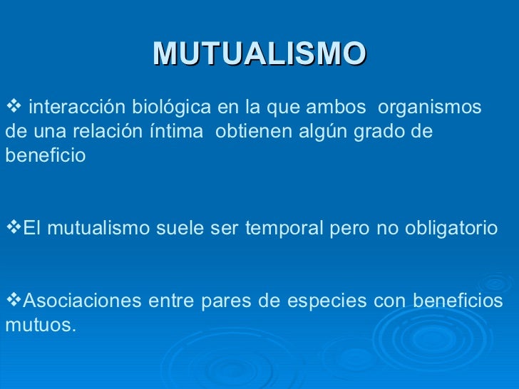 2. 2. MUTUALISMO <ul><li>interacción biológica en la que ambos organismos de una relación íntima obtienen algún grado de beneficio </li></ul><ul><li>El mutualismo suele ser temporal pero no obligatorio </li></ul><ul><li>Asociaciones entre pares de especies con beneficios mutuos. </li></ul>