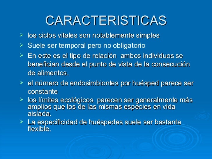 3. 4. CARACTERISTICAS <ul><li>los ciclos vitales son notablemente simples </li></ul><ul><li>Suele ser temporal pero no obligatorio </li></ul><ul><li>En este es el tipo de relación ambos individuos se benefician desde el punto de vista de la consecución de alimentos. </li></ul><ul><li>el número de endosimbiontes por huésped parece ser constante </li></ul><ul><li>los límites ecológicos parecen ser generalmente más amplios que los de las mismas especies en vida aislada. </li></ul><ul><li>La especificidad de huéspedes suele ser bastante flexible. </li></ul>