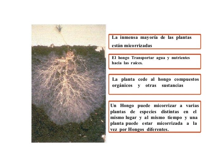 5. 8. La inmensa mayoría de las plantas están micorrizadas El hongo Transportar agua y nutrientes hacia las raíces. La planta cede al hongo compuestos orgánicos y otras sustancias que necesita para su crecimiento. Un Hongo puede micorrizar a varias plantas de especies distintas en el mismo lugar y al mismo tiempo y una planta puede estar micorrizada a la vez por Hongos diferentes.