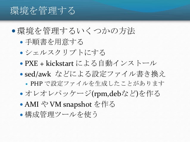 10. 10. 環境を管理する  環境を管理するいくつかの方法  手順書を用意する  シェルスクリプトにする  PXE + kickstart による自動インストール  sed/awk などによる設定ファイル書き換え  PHP で設定ファイルを生成したことがあります  オレオレパッケージ(rpm,debなど)を作る  AMI や VM snapshot を作る  構成管理ツールを使う