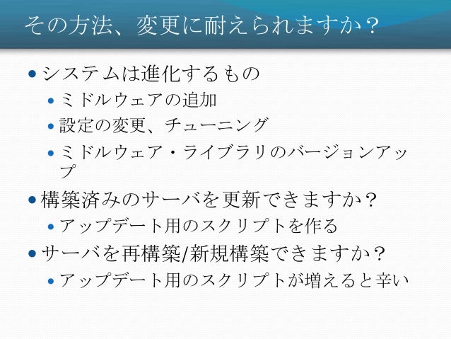 11. 11. その方法、変更に耐えられますか?  システムは進化するもの  ミドルウェアの追加  設定の変更、チューニング  ミドルウェア・ライブラリのバージョンアッ プ  構築済みのサーバを更新できますか?  アップデート用のスクリプトを作る  サーバを再構築/新規構築できますか?  アップデート用のスクリプトが増えると辛い