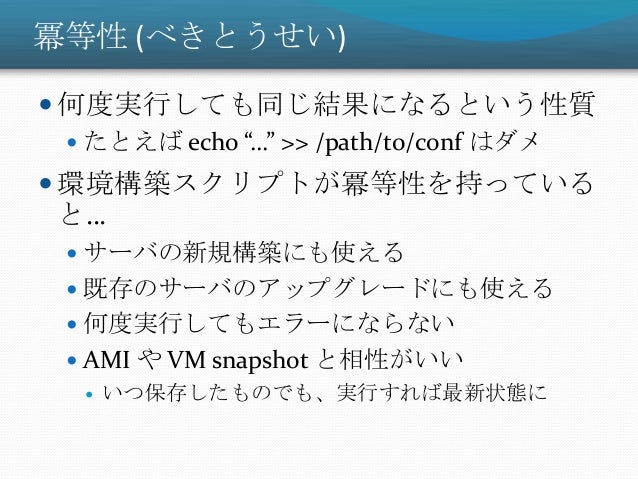 12. 12. 冪等性 (べきとうせい)  何度実行しても同じ結果になるという性質  たとえば echo “…” >> /path/to/conf はダメ  環境構築スクリプトが冪等性を持っている と…  サーバの新規構築にも使える  既存のサーバのアップグレードにも使える  何度実行してもエラーにならない  AMI や VM snapshot と相性がいい  いつ保存したものでも、実行すれば最新状態に