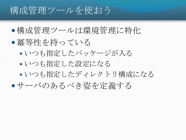 13. 13. 構成管理ツールを使おう  構成管理ツールは環境管理に特化  冪等性を持っている  いつも指定したパッケージが入る  いつも指定した設定になる  いつも指定したディレクトリ構成になる  サーバのあるべき姿を定義する