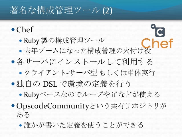15. 15. 著名な構成管理ツール (2)  Chef  Ruby 製の構成管理ツール  去年ブームになった構成管理の火付け役  各サーバにインストールして利用する  クライアント-サーバ型 もしくは単体実行  独自の DSL で環境の定義を行う  Rubyベースなのでループや if などが使える  OpscodeCommunityという共有リポジトリが ある  誰かが書いた定義を使うことができる