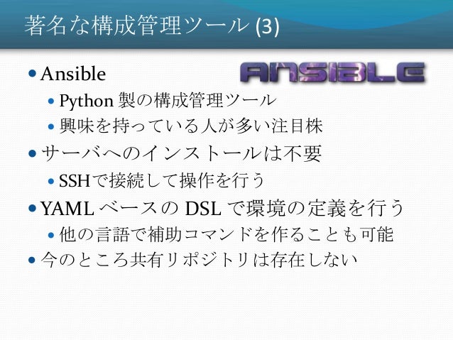 16. 16. 著名な構成管理ツール (3)  Ansible  Python 製の構成管理ツール  興味を持っている人が多い注目株  サーバへのインストールは不要  SSHで接続して操作を行う  YAML ベースの DSL で環境の定義を行う  他の言語で補助コマンドを作ることも可能  今のところ共有リポジトリは存在しない