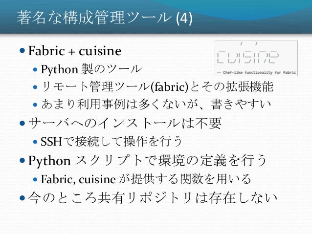 17. 17. 著名な構成管理ツール (4)  Fabric + cuisine  Python 製のツール  リモート管理ツール(fabric)とその拡張機能  あまり利用事例は多くないが、書きやすい  サーバへのインストールは不要  SSHで接続して操作を行う  Python スクリプトで環境の定義を行う  Fabric, cuisine が提供する関数を用いる  今のところ共有リポジトリは存在しない