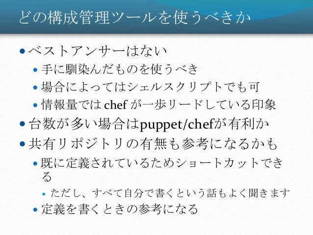 19. 19. どの構成管理ツールを使うべきか  ベストアンサーはない  手に馴染んだものを使うべき  場合によってはシェルスクリプトでも可  情報量では chef が一歩リードしている印象  台数が多い場合はpuppet/chefが有利か  共有リポジトリの有無も参考になるかも  既に定義されているためショートカットでき る  ただし、すべて自分で書くという話もよく聞きます  定義を書くときの参考になる