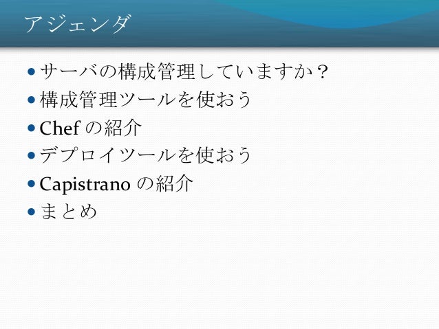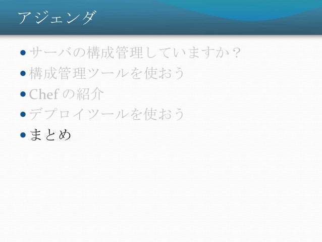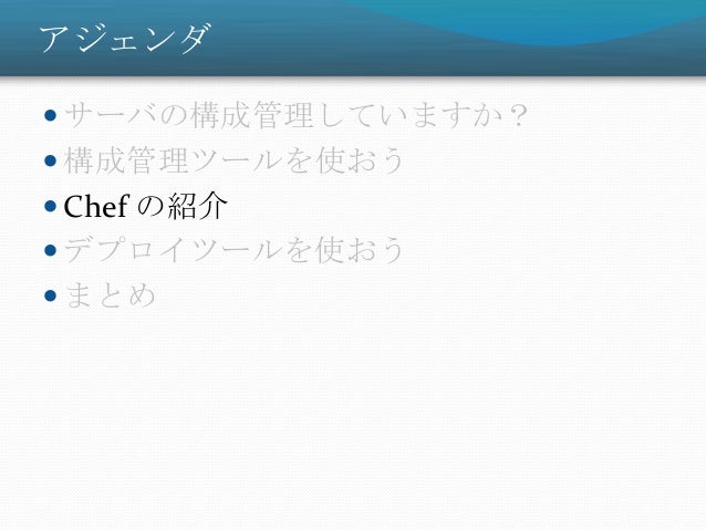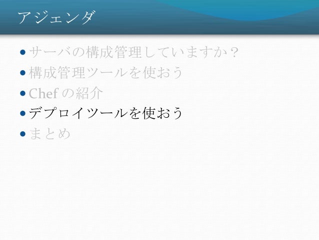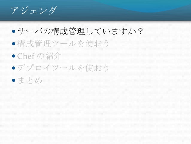 31. 31. アジェンダ  サーバの構成管理していますか?  構成管理ツールを使おう  Chef の紹介  デプロイツールを使おう  まとめ