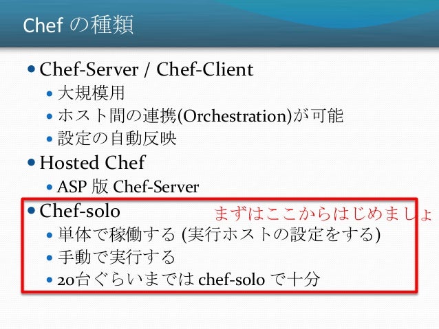 22. 22. Chef の種類  Chef-Server / Chef-Client  大規模用  ホスト間の連携(Orchestration)が可能  設定の自動反映  Hosted Chef  ASP 版 Chef-Server  Chef-solo  単体で稼働する (実行ホストの設定をする)  手動で実行する  20台ぐらいまでは chef-solo で十分 まずはここからはじめましょう